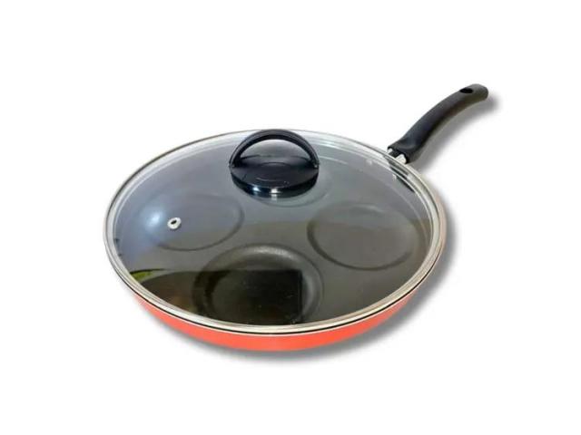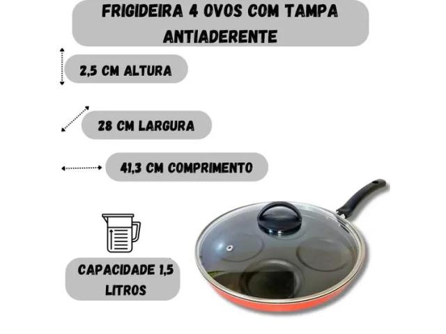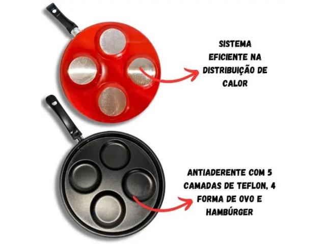 Frigideira 4 em 1 Multiuso com Divisória Antiaderente faz Ovos e Hamburgers, acompanha tampa de vidro temperado com Saída de vapor, o que permite visualizar o processo de cozimento dos alimentos. Design arrojado, beleza e muito charme, o diferencial desse Item, está em seu material, alumínio de alta qualidade, espessura de 1,1 mm, que confere ao item uma estrutura resistente garantindo a durabilidade e distribuição eficiente do calor, proporcionando o cozimento mais rápido e uniforme dos alimentos. Revestido com 5 camadas de antiaderente TEFLON (DuPont) - PFOA Free, internamente e externamente, evitando que o alimento grude na superfície, o que possibilita o preparo dos alimentos com menos gordura, além de proporcionar praticidade no momento da limpeza. Possui cabo reforçado ergonômico, feito em baquelite, material antitérmico que não retém calor, para garantir facilidade e máxima segurança no manuseio.